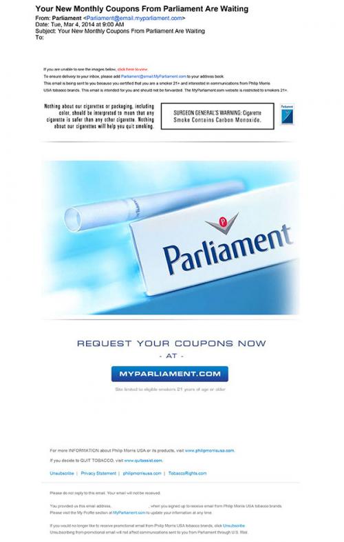Email from Parliament received on March 4, 2014 inviting the receiver to request their coupons now at MyParliament.com. Coupons are available monthly through the website.