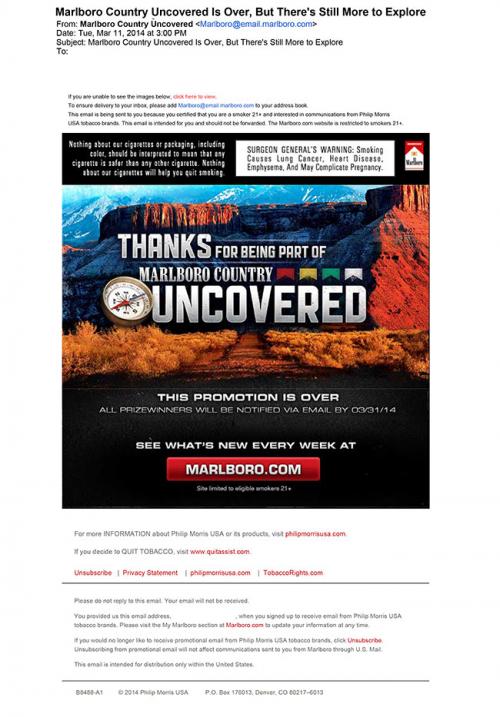 Email from Marlboro received on March 11, 2014 informing the receiver that the Marlboro Country Uncovered sweepstakes is over and thanking them for being a part of it. The email states that there is still more to explore and invites the receiver to "see what's new every week at Marlboro.com."