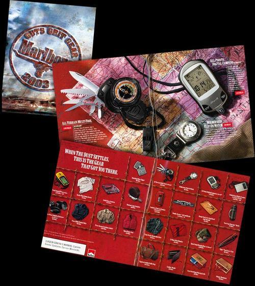 Marlboro product catalog - "When the dust settles, this is the gear that got you there." Watch and compass/pocket knife pictured. Marlboro Miles campaign.