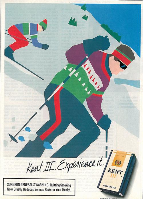 Magazine ad from Kent containing an animated image of men skiing and an image of a pack of Kent III's. Text: "Kent III. Experience it."
