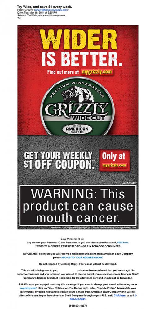 Email from Grizzly received on March 18, 2014 advertising their new Premium Wintergreen Wide Cut product with text, "Wider is Better", and an image of a can of the product. The email also invites the receiver to the brand's website to "get your weekly $1 off coupon."
