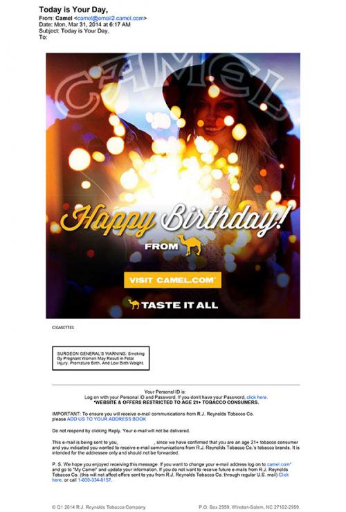 Email from Camel received on March 31, 2014 wishing the receiver a happy birthday. The email includes a colorful image of a young woman in the background, and a link to visit the brand's website.