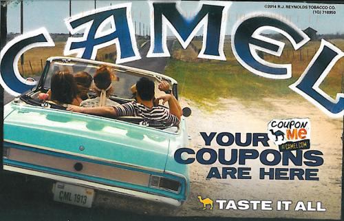 Direct mail from Camel received in March 2014 delivering coupons the receiver ordered online. The piece contains an image of a large variety of Camel cigarette and snus products, and invites the receiver to order coupons every month at Camel.com. Direct mail received in NJ, TX and DC.