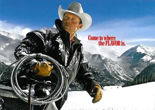 Direct mail from Marlboro featuring images of cowboys riding horses in the snowy mountains. The piece delivers a coupon and directs the receiver to Marlboro.com "for more flavor." Text: "Come to where the flavor is. Come to Marlboro Country."