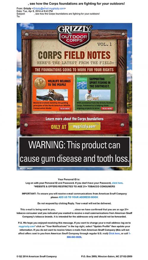 Email from Grizzly received on April 8, 2014 updating the receiver on how the two foundations that won the Grizzly Outdoor Corps contest are doing. The email provides links to read more about the "Corps Field Notes" for Boone & Crockett and FishAmerica Foundations.