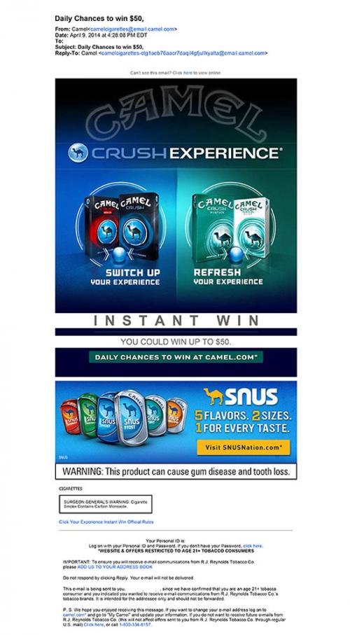 Email from Camel received on April 9, 2014 advertising their new Instant Win sweepstakes on their website with the chance to win up to $50. The piece also advertises the variety of Camel Crush products as well as the variety of Camel Snus products.