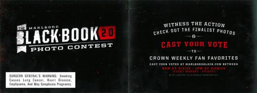 Direct mail from Marlboro received in March 2014 advertising the Marlboro Black Book Photo Contest 2.0. The piece invites receivers to "witness the action, check out the finalist photos & cast your vote to crown weekly fan favorites" at MarlboroBlack.com. The piece also invites the receiver to claim their free Zippo lighter on the Marlboro Black website, advertises Marlboro Edge, and delivers coupons.