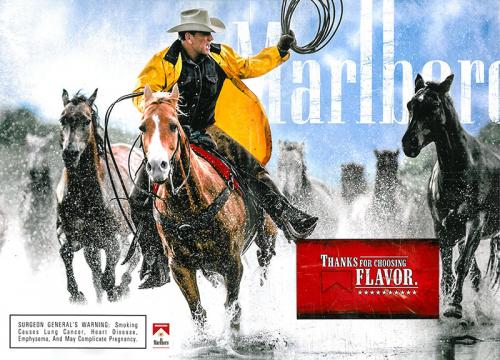 Direct mail from Marlboro received in April 2014 delivering coupons to the receiver. The piece includes various images of cowboys, horses, and ranches. The piece directs the receiver to Marlboro's website "for more flavor."