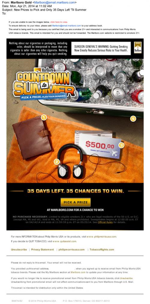 Email received from Marlboro in April 2014 promoting Marlboro's Countdown to Summer Sweepstakes. The receiver can enter daily for a chance to win summer themed prizes.