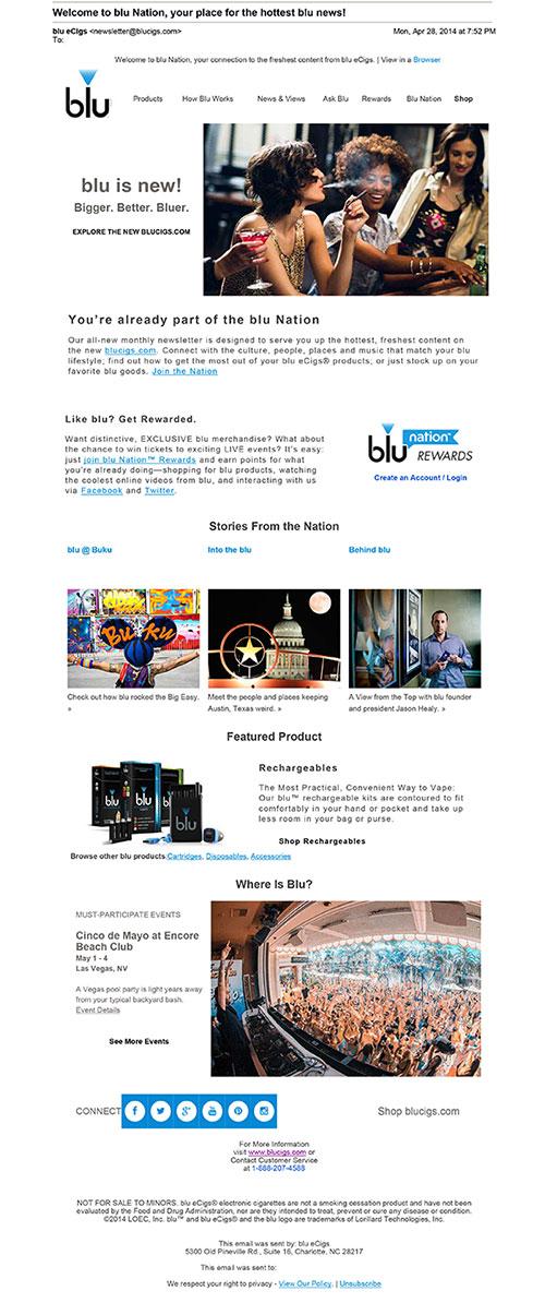 Email from Blu received on April 28, 2014 advertising "Blu Nation", a feature on their new website. This new monthly newsletter allows the receiver to "connect with the culture, people, places, and music that match [his or her] blu lifestyle." The email advertises Blu Nation rewards, rechargeables as the featured product, and a Cinco de Mayo event in Las Vegas,