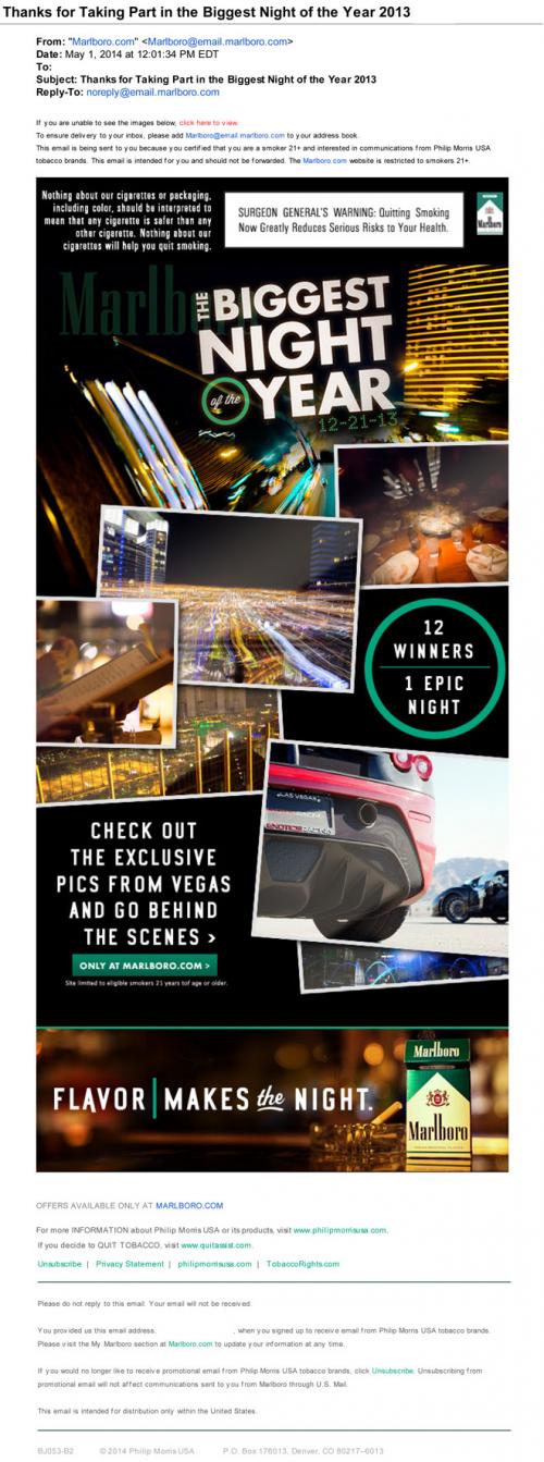 Email received from Marlboro in May 2014 thanking the receiver for participating in The Biggest Night ever 2013 sweepstakes. The email also invites the receiver to visit the brand's website to view how the 12 winners spent their night in Vegas.