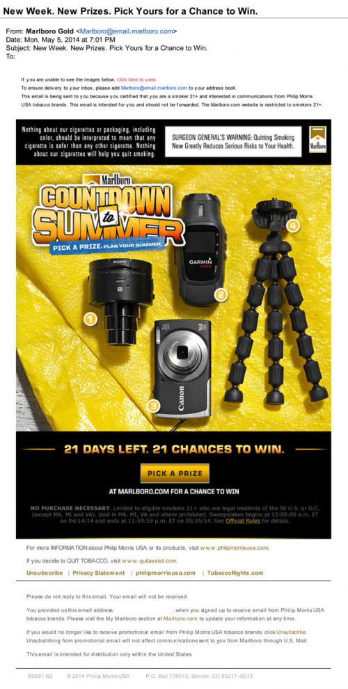 Email received from Marlboro in May 2014 promoting the Marlboro Countdown to Summer sweepstakes. The email contains pictures of a smartphone camera, a Garmin camera, a digital camera, and a tripod, which are the four prizes that can be entered to win this week. Text: "21 Days Left. 21 Chances to Win."