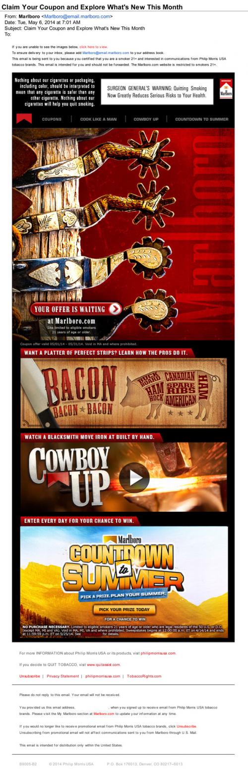 Email received from Marlboro in May 2014 inviting the receiver to the brand's website to retrieve their monthly coupon. Additionally, the email invites the receiver to view the Master of Meats and Cowboy Up website content as well as enter the Countdown to Summer sweepstakes.
