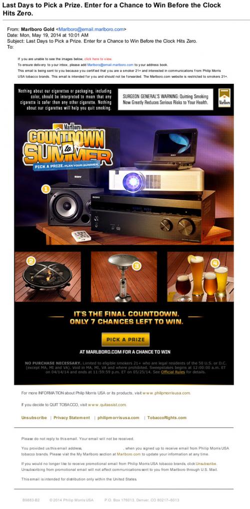 Marlboro Countdown to Summer sweepstakes. The email contains pictures of
