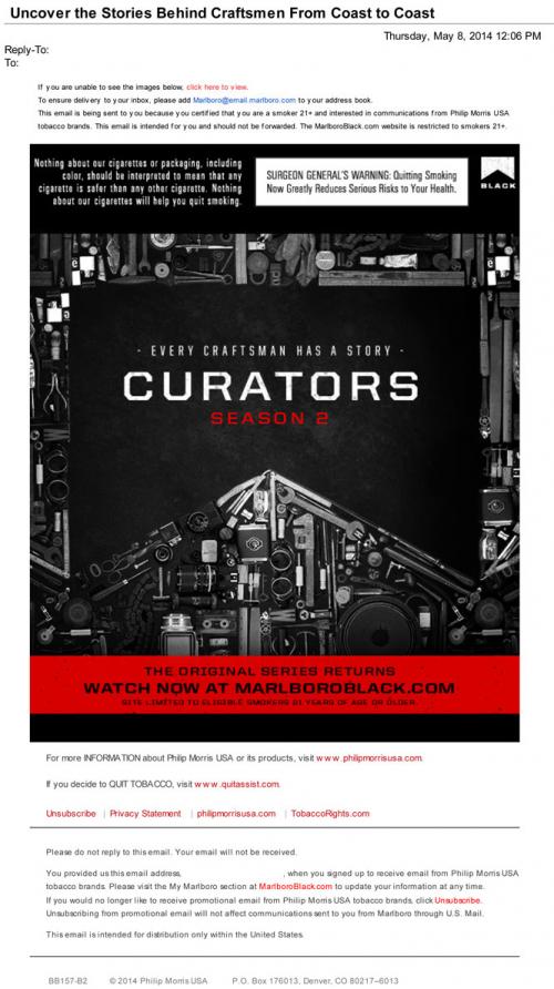 Email received from Marlboro in May 2014 inviting the receiver to their brand website to view season 2 of their curators series. Text: "Every Craftsman Has A Story."