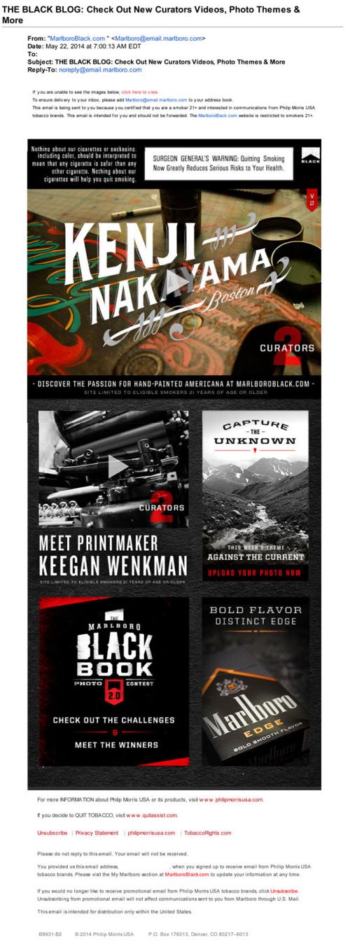 Email received from Marlboro in May 2014 informing the receiver about the brand's website newest Curators 2 post. The email also invites the receiver to view previous Curator 2 posts, this week's capture the unknown theme, and the Marlboro Black Book photo contest challenges and winners.