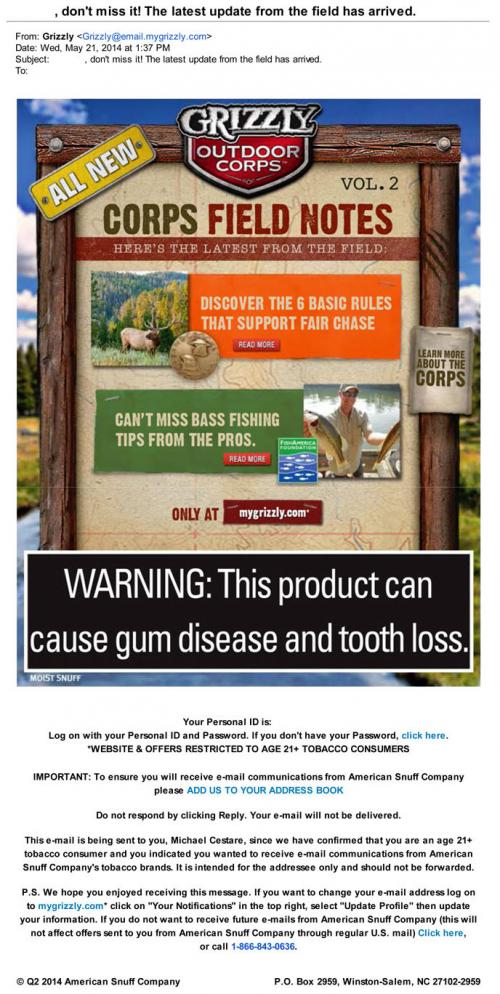 Email received from Grizzly in May 2014 informing the receiver about tips for hunting and fishing from the two foundations that won money from the Grizzly Outdoor Corps contest.
