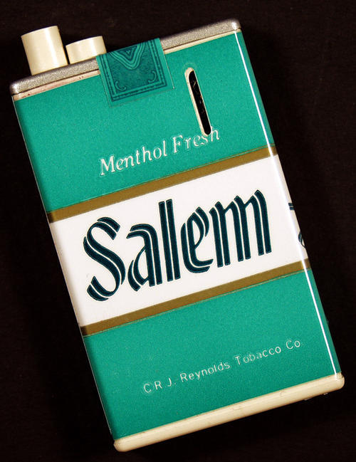 Refillable Electra Quartz Button Lighter. Green and white Salem colors, designed to resemble Salem cigarette pack.