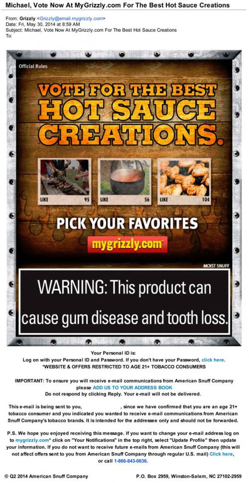 Email received from Grizzly in May 2014 inviting the receiver to the brand's website to vote for their favorite hot sauce creations. Text: "Vote for the best hot sauce creations."