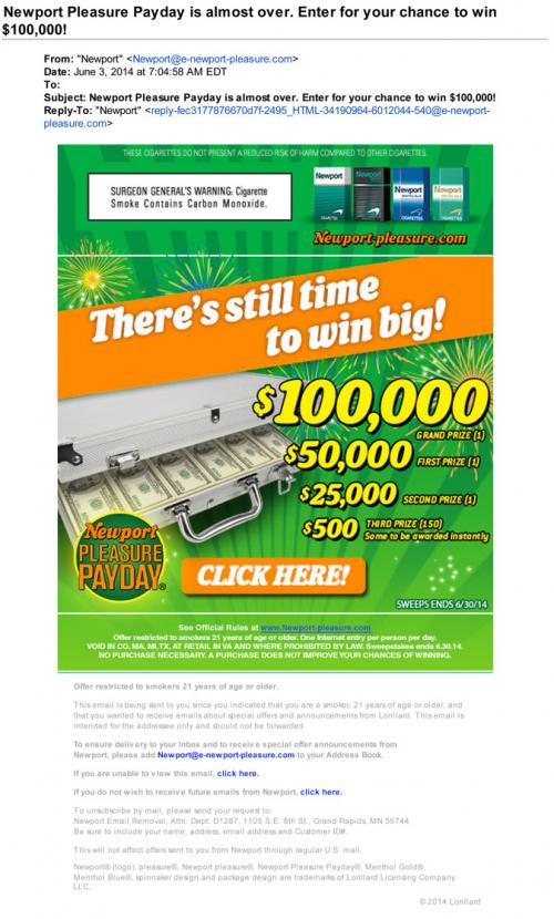 Email received from Newport in June 2014 informing the receiver that there is still to enter Newport Pleasure Payday. The email invites the receiver to enter the sweepstakes on the brand's website in order for the chance to possibly win $100,000, $50,000, $25,000, or $500. Text: "There's still time to win big."