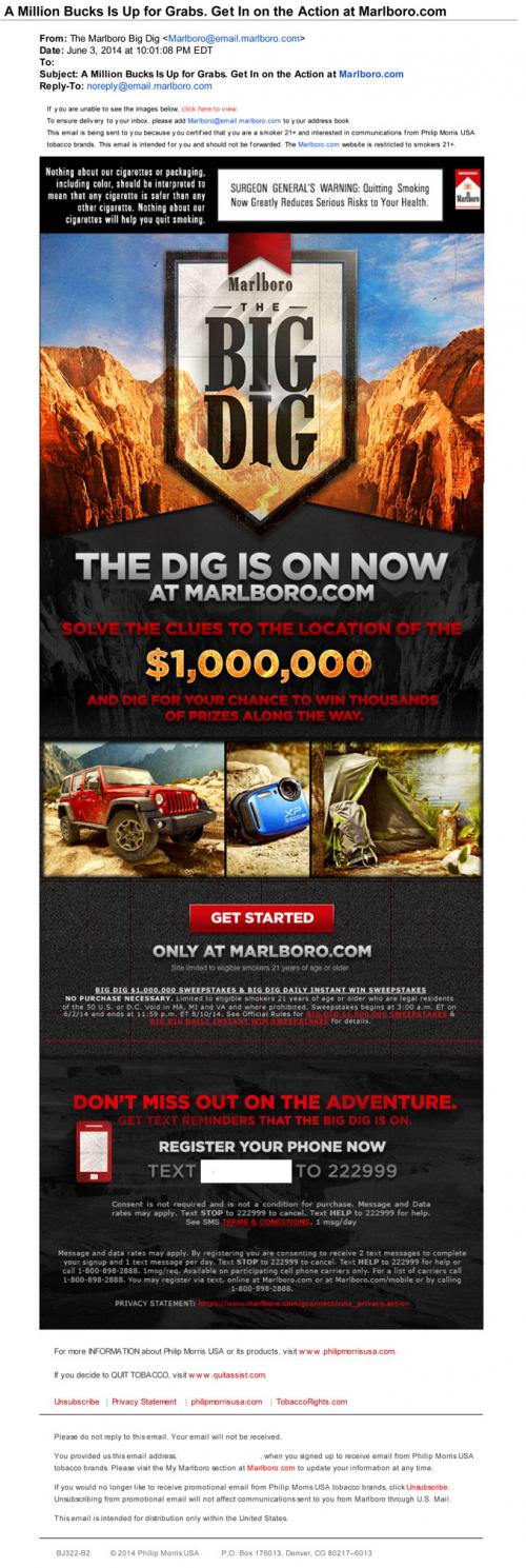 Email received from Marlboro in June 2014 promoting The Big Dig sweepstakes. The email invites the receiver to the brand's website in order to solve clues for the chance to win $1,000,000 and other prizes. The email also encourages the receiver to sign up for text message reminders about the sweepstakes. Text: "The dig is on now at marlboro.com."