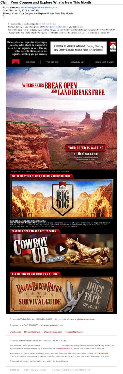 Email received from Marlboro in June 2014 ncouraging the receiver to visit the brand's website in order to claim this month's coupon, enter The Big Dig Sweepstakes, watch how spurs are crated in the cowboy up section of the website, and learn about bacon. Text: Where skies break open and land breaks free."