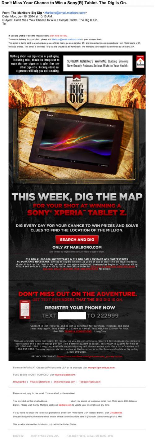 Email received from Marlboro in June 2014 inviting the receiver to the brand's website to participate in the The Big Dig Sweepstakes for the chance to win this week's prize a tablet. The email also encourages the receiver to sign up for text reminders about the sweepstakes.