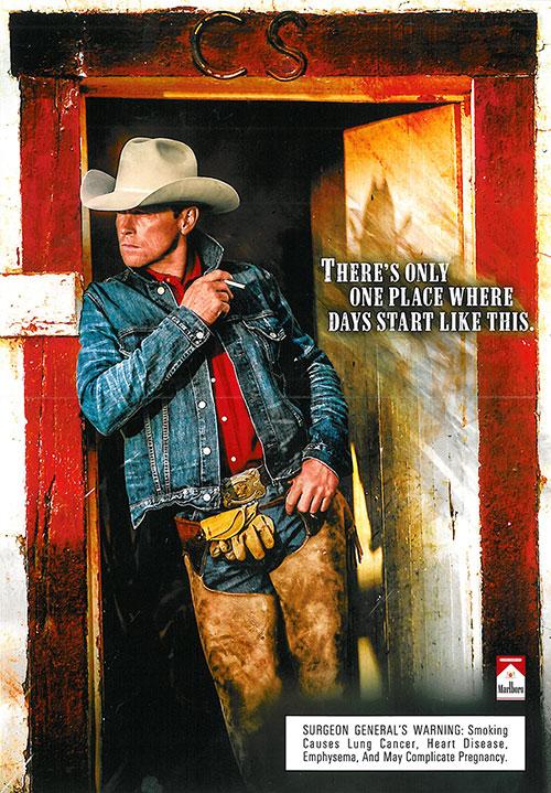 Marlboro direct mailing received in June 2014. Piece features a cowboy standing outside of a barn, smoking a cigarette, looking off into the distance. Piece also includes 2 coupons; both for $1.00 off a pack of any style Marlboro cigarettes. Text: "There's only one place where days start like this. Marlboro Country."