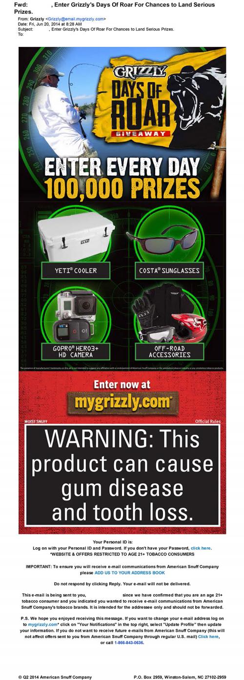E-mail from Grizzly received in June 2014 reminding the user to enter Grizzly's Days of Roar Giveaway for a chance to "land serious prizes." Text: "Enter every day, 100,000 prizes." Prizes featured in the e-mail include a Yeti cooler, Costa sunglasses, GoPro Hero3+ HD Camera, and other off-road accessories. Users are directed to visit mygrizzly.com to enter.