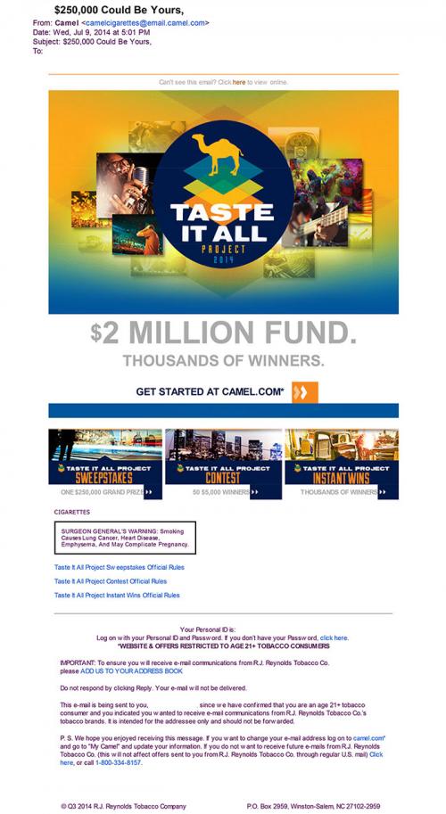 E-mail from Camel received in July 2014 promoting their new "Taste It All Project" sweepstakes. Users are invited to participate online at camel.com for their chance to win $250,000. One grand prize winner will win $250,000 while 50 winners will be awarded $5,000. Thousands will be eligible for instant wins on the website.