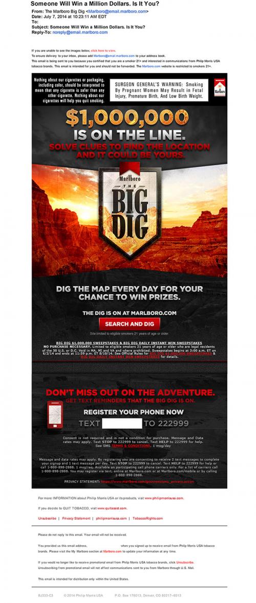 E-mail from Marlboro received in July 2014 reminding the receiver to enter Marlboro's "Big Dig" sweeps online. Users can solve clues and find the location of the $1,000,000 by digging on the online map every day for their chance at winning prizes. Users can also get text reminders by registering their phone numbers and texting a code to 222999. Text: "$1,000,000 is on the line. Solve clues to find the location and it could be yours. Dig the map every day for your change to win prizes. The dig is on at marlboro.com. Don't miss out on the adventure. Get text reminders that the big dig is on."