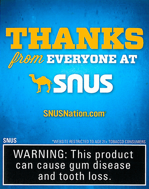 Direct Mail from Camel Snus delivering a free custom-designed decal. The piece thanks the receiver "for showing us your flavor". Text: "Thanks from Everyone at Snus"