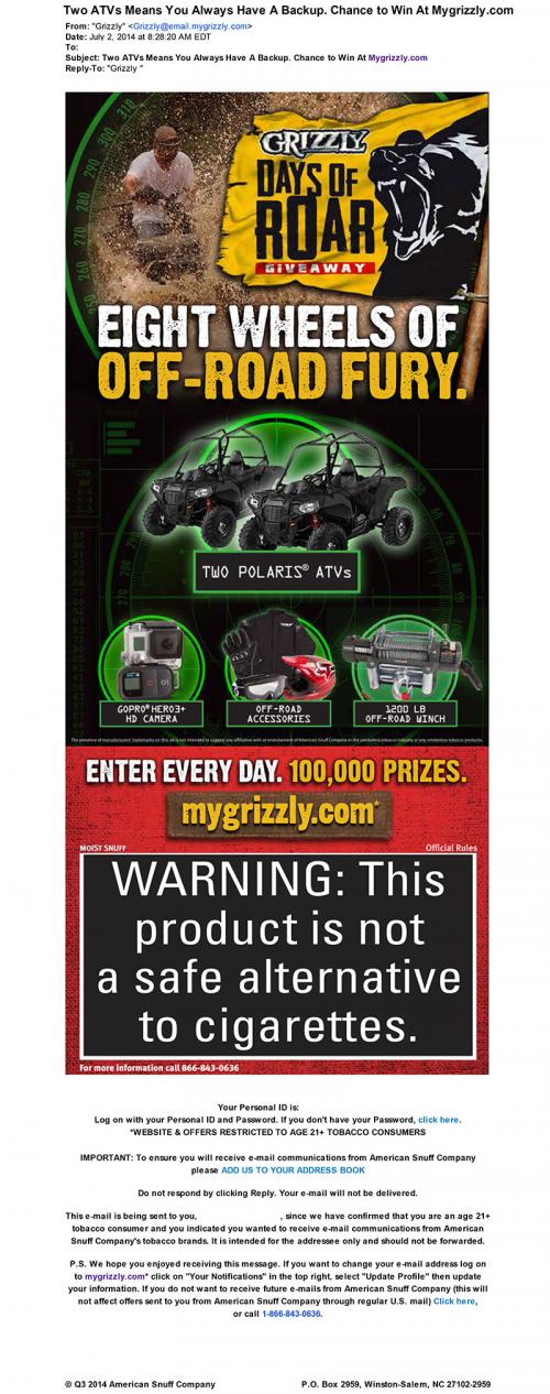 E-mail from Grizzly received in July 2014 reminding the receiver to enter the "Days of Roar" giveaway online at mygrizzly.com. Text: "Two ATV's means you always have a back up. Chance to win at mygrizzly.com. Eight wheels of off-road fury. Enter every day. 100,000 prizes."