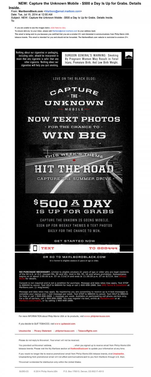 E-mail from Marlboro received in July 2014 letting users know about the new "Capture the Unknown" mobile daily win. Users are invited to take photos each day and text them in for their chance to win big. Each week, Marlboro will post a theme (7/14/2014 weekly theme: Hit the Road - Capture the summer drive) and users will have to take a photo that represents the theme. $500 is up for grabs each day.