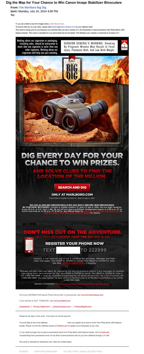 Email received from Marlboro in July 2014 inviting the receiver to the brand's website to participate in the The Big Dig Sweepstakes for the chance to win this week's prize - Canon Image Stabilizer Binoculars. The email also encourages the receiver to sign up for text reminders about the sweepstakes.