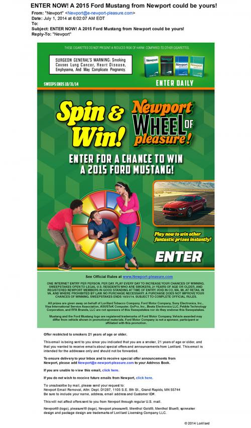 E-mail from Newport received in July 2014 letting users know they can now enter Newport's Wheel of Pleasure sweepstakes for their chance to win a new 2015 Ford Mustang. Users are encouraged to "spin and win" for their chance to win the Mustang and other "fantastic prizes" instantly. E-mail includes a link to the website.