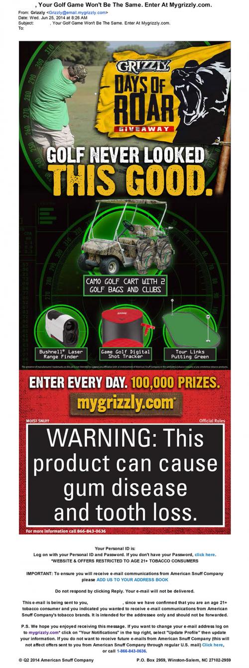 E-mail from Grizzly received in June 2014 reminding users to enter Grizzly's Days of Roar Giveaway for their chance to win a camo golf cart with 2 golf bags and clubs. Other prizes featured in the e-mail include a Bushnell Laser Range Finder, Game Golf Digital Shot Tracker, and Tour Links Putting Green. Users can enter every day at mygrizzly.com. Text: "Your Golf game won't be the same. Enter at Mygrizzly.com. Golf never looked this good"