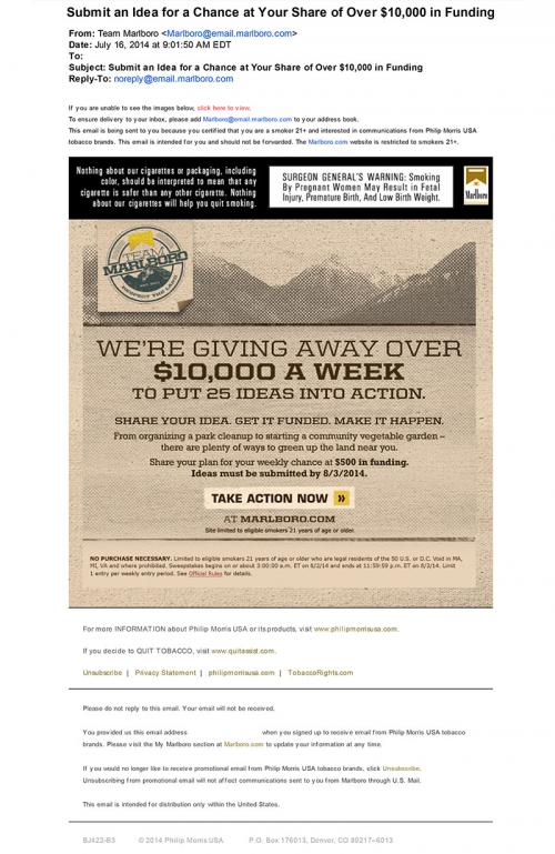 E-mail from Marlboro received in July 2014 encouraging users to help "green up the land" by sharing their idea online and getting their idea funded. Text: We're giving away over $10,000 a week to put 25 ideas into action. Share your idea. Get it funded. Make it happen. From organizing a park cleanup to starting a community vegetable garden - there are plenty of ways to green up the land near you. Share your plan for your weekly chance at $500 in funding. Ideas must be submitted by 8/3/2014"