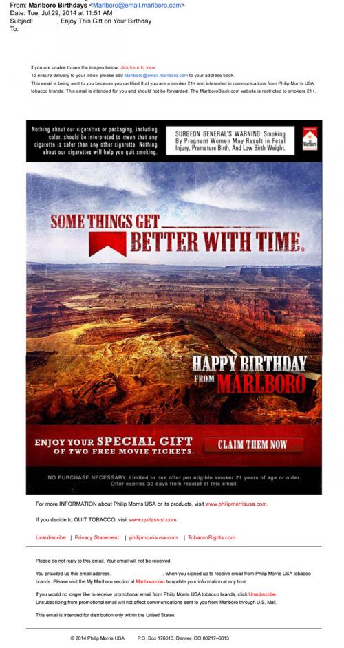from Marlboro in end of July 2014. It includes a gift of two free movie tickets and a link to claim them. Text: "Some Things Get Better With Time. Happy Birthday from Marlboro."