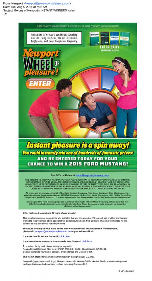 E-mail Sweepstakes Tobacco Product