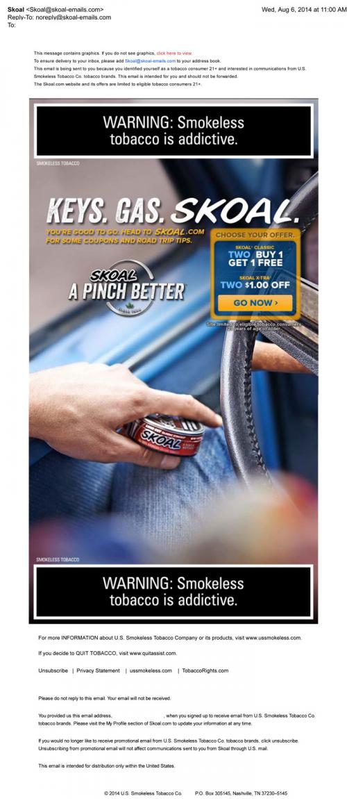 Skoal in August 2014 inviting the receiver to the brand's website for some road trip tips as well as to claim this month's