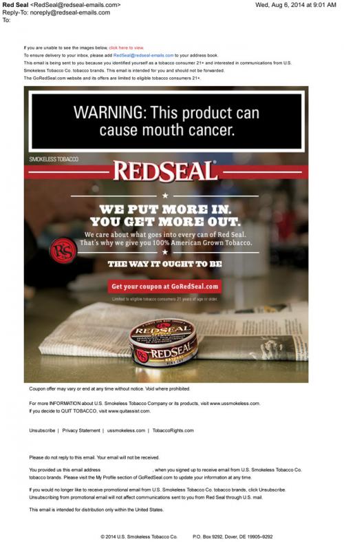 Red Seal in August 2014 assuring the receiver of the time they put into each Red Seal can. There is also a link to a coupon. Text: "We put more in. You get more out. We care about what goes into every can of Red Seal. That's why we give you 100% American Grown Tobacco. The way it ought to be."