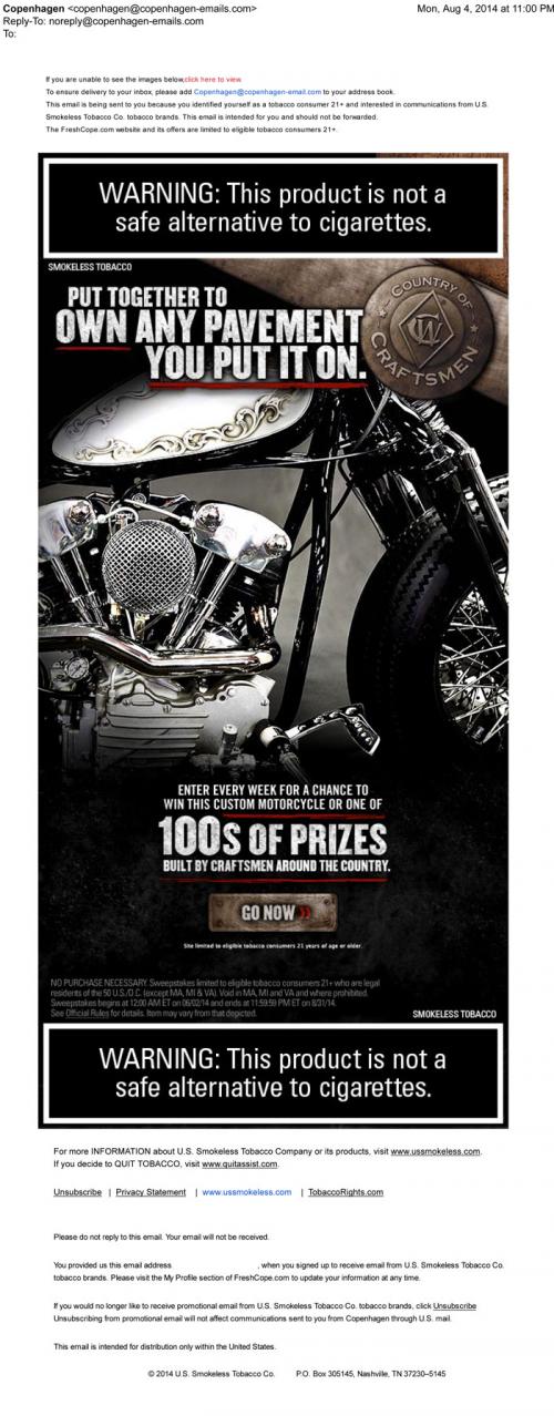 received on August 4, 2014 inviting the receiver to enter for a chance to win prizes created by experienced craftsmen. Text with closeup of a classic cut-edged motorcycle "Put together to own any pavement you put it on."