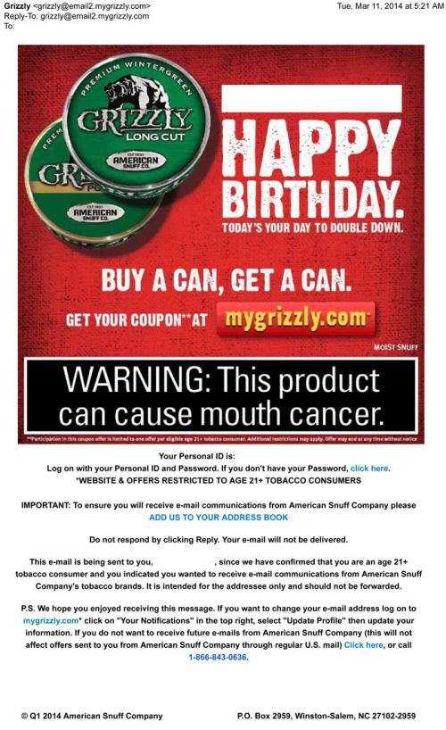Grizzly sends a Happy Birthday email to one of its customers with a coupon offer. Text: "Buy a can, get a can. Get your coupon at mygrizzly.com"