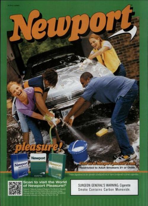 Newport Pleasures ad shows a group of people enjoying a car wash. Text: "Newport Pleasure!"