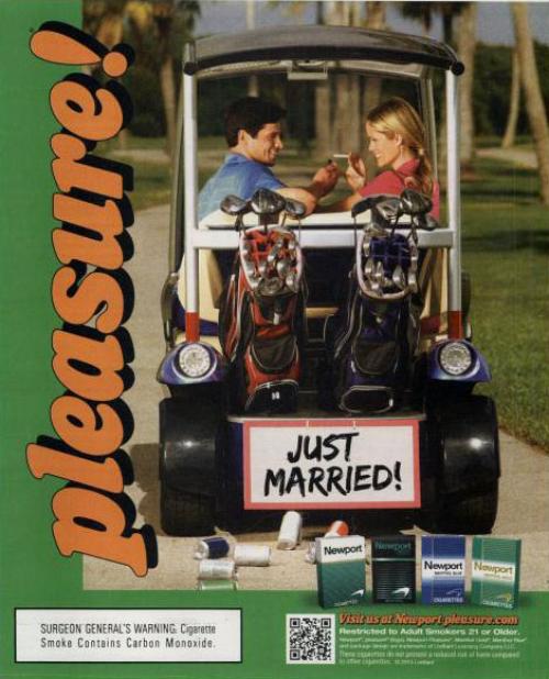Newport Pleasure ad of a couple that just got married. Set in a golfing area, the wife is holding a Newport cigarette and her husband is lighting it for her. Text: pleasure!