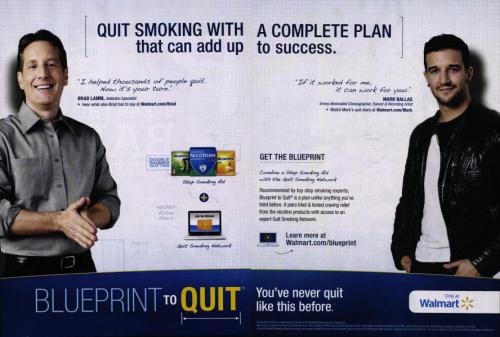 "Quit smoking with a complete plan that can add up to success." This full 2 page ad presents an image of an Addiction Specialist Brad Lamm, and an Emmy award winning- celebrity choreographer Mark Ballas and their input on Nicoderm and Nicorette and how it is possible to quit smoking.