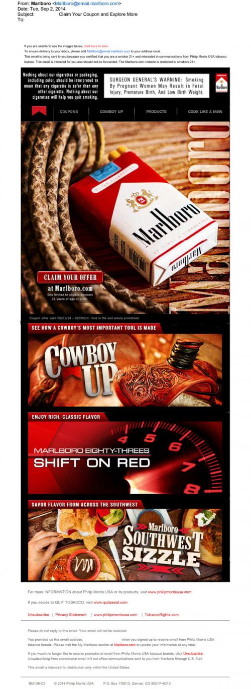 E-mail from Marlboro received September 2014 reminding the receiver to claim their coupon online at Marlboro.com and to "see how a cowboy's most important tool is made." E-mail also promotes Marlboro Eighty-Threes product "Enjoy Rich, Classic Flavor." As well as Marlboro's Southwest Sizzle campaign.