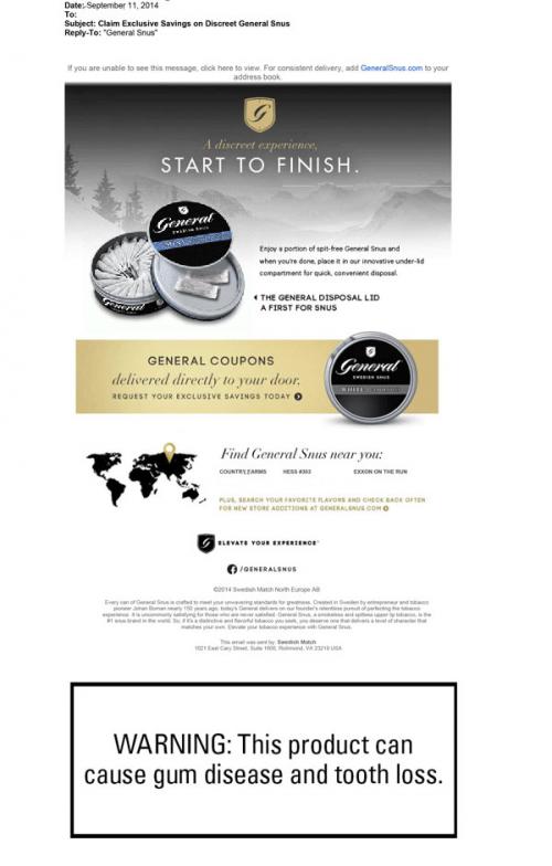 Email received from General Snus in September 2014 informing user of the new disposal lid, a discrete compartment for easy disposal. Email also invites the user to the to the brand website for coupons and conveniently lists the nearest stores where General Snus is available using receiver's provided address. text: "A discreet experience, start to finish."