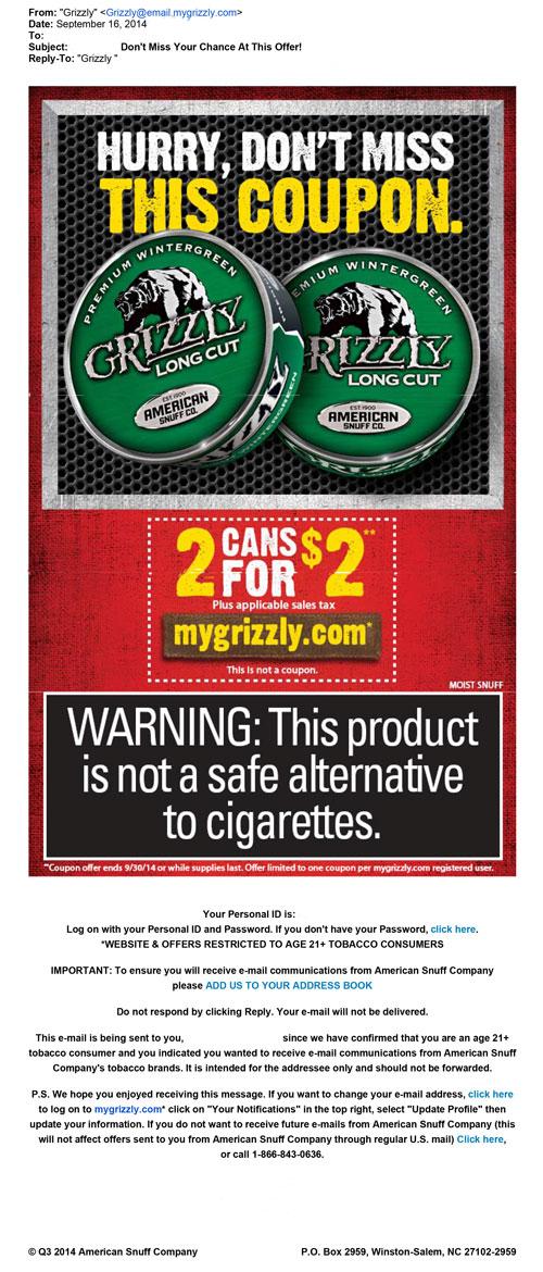 Email received from Grizzly in September 2014 directing the receiver to the brand website to claim their coupon. Text: "Hurry, Don't Miss This Coupon. 2 Cans for $2."